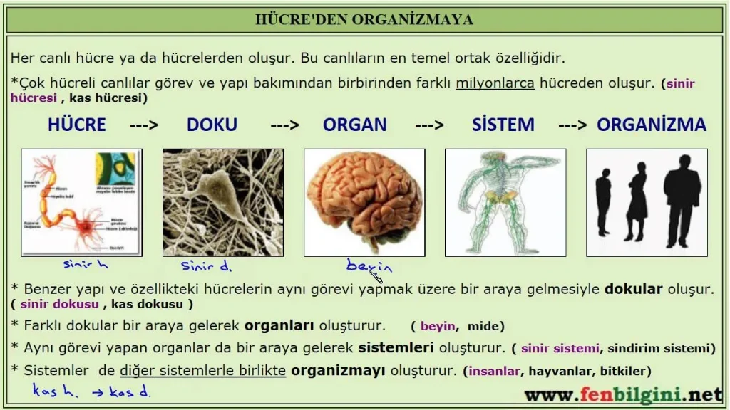 | Doku ve organ sistemleri | Epitel, bağ dokusu, kas dokusu ve sinir dokusu gibi temel doku türlerini bir araya getirerek organları ve organ sistemlerini oluşturur. Örn: sindirim sistemi mide, bağırsaklar ve karaciğeri içerir; enerji üretimi ve metabolizma bu süreçlerle gerçekleşir. |